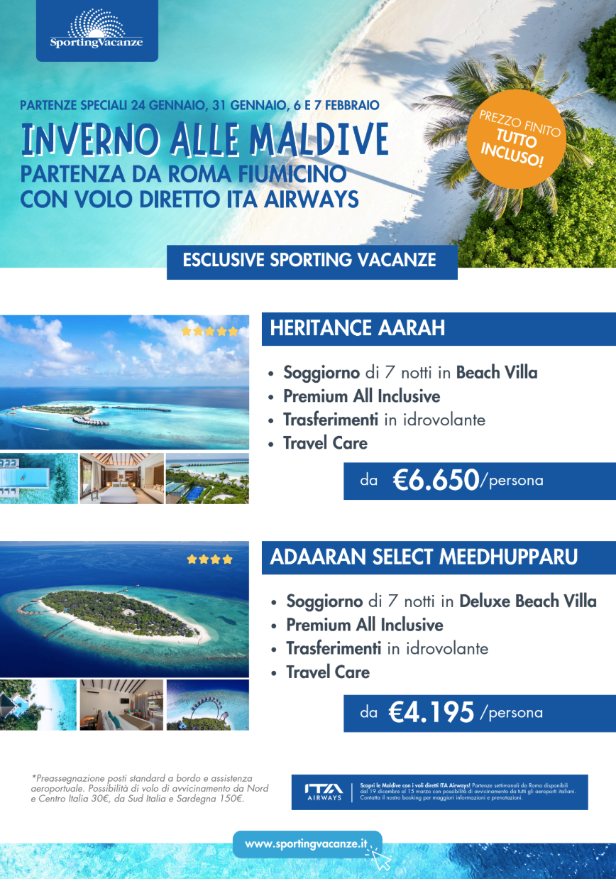 L’atmosfera maldiviana guida ad un naturale stato di relax: la spiaggia fine, le onde dell’Oceano, i colori in perfetta armonia sono gli ingredienti ideali per momenti unici, da vivere completamente. Ma le isole offrono anche dei servizi attraverso le migliori spa. Una giornata alla spa significa massaggi e benessere nel lusso circondato dai terapeutici colori di una meravigliosa natura selvaggia.Sei alla ricerca di una vacanza rilassante e avventurosa?Eleganti resort, meravigliose spiagge di sabbia bianca e splendide acque cristalline, sono solo alcuni degli elementi che fanno di un soggiorno alle Maldive un’incredibile vacanza da sogno. Momenti di assoluto relax in un ambiente marino incontaminato, si alternano a divertenti sport acquatici ed emozionanti escursioni, gite in barca, cene notturne in mare aperto e altre divertenti attività, proposte dalle diverse strutture.